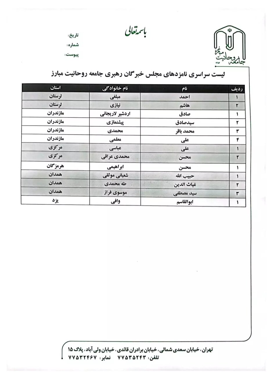 جامعه روحانیت مبارز با نشستها و رایزنیهای گسترده ضمن احترام به همه نامزدهای مجلس خبرگان رهبری افراد زیر را شایسته انتخاب شما مردم بزرگوار میشناسد. امیدواریم با حضور گسترده و انتخاب احسن، برگ زرین دیگری در دفتر افتخارات خود ثبت کند. فهرست اسامی نامزدها به شرح ذیل است: