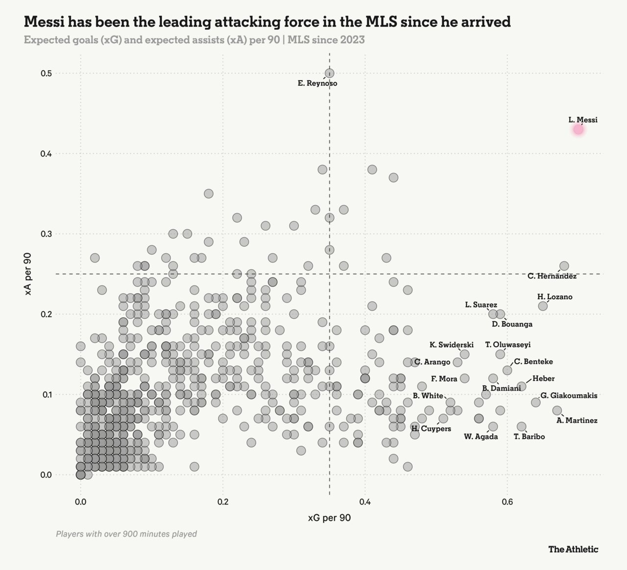 از زمان ورودش در سال 2023، او در 42 بازی لیگ 34 گل به ثمر رسانده است، با نرخ بالای 0.92 گل به ازای هر 90 دقیقه در MLS. نمودار زیر، که xG (گلهای مورد انتظار) و xA (پاسهای گل مورد انتظار) به ازای هر 90 دقیقه از زمان اولین بازی او را نشان میدهد، تأثیر همهجانبه او را مشخص میکند. جایی که مسی بهعنوان یک استثنا در خلق موقعیت و تمامکنندگی برجسته است.