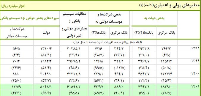 در سند بانک مرکزی که با عنوان نماگرهای اقتصادی شماره 111 منتشر شده، وضعیت متغیرهای پولی از جمله میزان بدهی دولت به بانک مرکزی گزارش شده است. همانطور که این سند نشان می دهد در حالی که دولت سیزدهم ادعا می کند 53 هزار میلیارد تومان از بدهی دولت دوازدهم را تسویه کرده است، میزان بدهی دولت به بانک مرکزی از 115 هزار میلیارد تومان در انتهای سال 1399 به 183 هزار میلیارد تومان در انتهای سال 1401 افزایش یافته است.