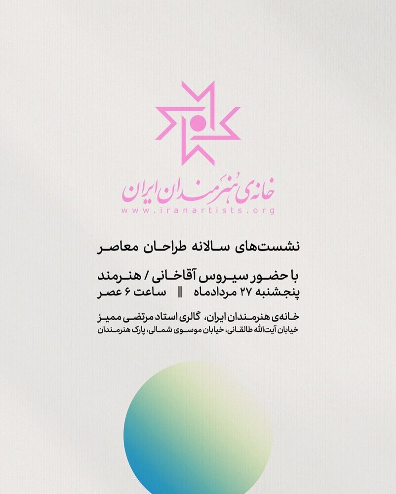 این جلسه با عنوان «تجربه معاصر بودن» از ساعت 18 تا 20 در گالری استاد ممیز خانه هنرمندان ایران برگزار میشود و طی آن سیروس آقاخانی به بیان تجربیات شخصی خود از مواجهه با مسائل گوناگون و انعکاس آن در طراحی میگوید.