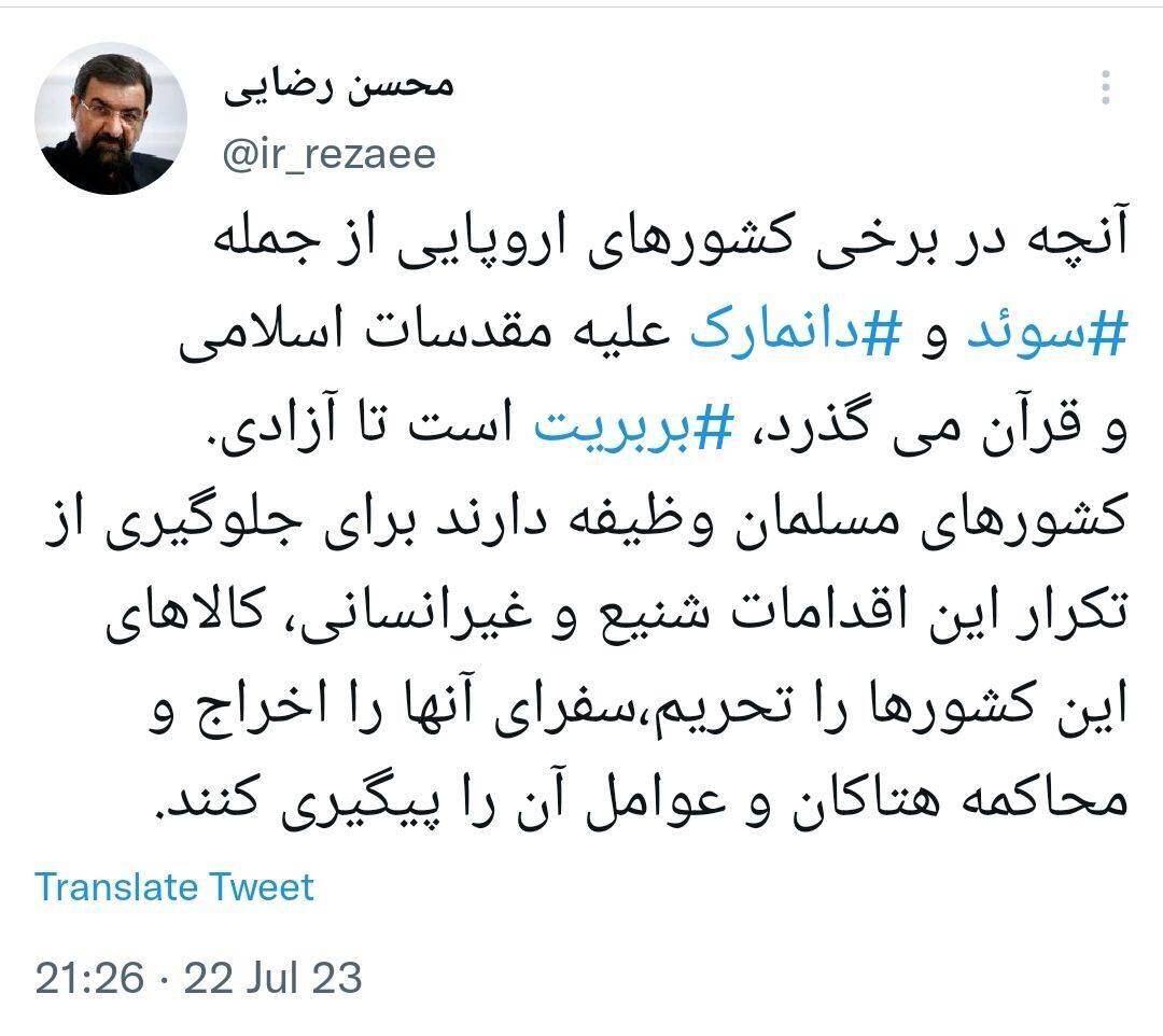 محسن رضایی، عضو مجمع تشخیص مصلحت در واکنش به هتک حرمت به قرآن کریم در توئیتی نوشت: «آنچه در برخی کشورهای اروپایی از جمله سوئد و دانمارک علیه مقدسات اسلامی و قرآن می گذرد، بربریت است تا آزادی. کشورهای مسلمان وظیفه دارند برای جلوگیری از تکرار این اقدامات شنیع و غیرانسانی، کالاهای این کشورها را تحریم، سفرای آنها را اخراج و محاکمه هتاکان و عوامل آن را پیگیری کنند.»