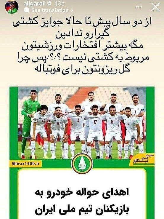 در ادامه و با واکنش براداران گرایی مشخص شد کشتی گیران ایرانی دو سال است که پاداش های اندک خود را دریافت نکرده اند؛ برادران گرایی نوشتند: «از دو سال پیش تا حالا جوایز کشتی گیران را نداده اید. مگر بیشتر افتخارات ورزش تان مربوط به کشتی نیست؟ پس چرا گل ریزان تان برای فوتبال است؟!»