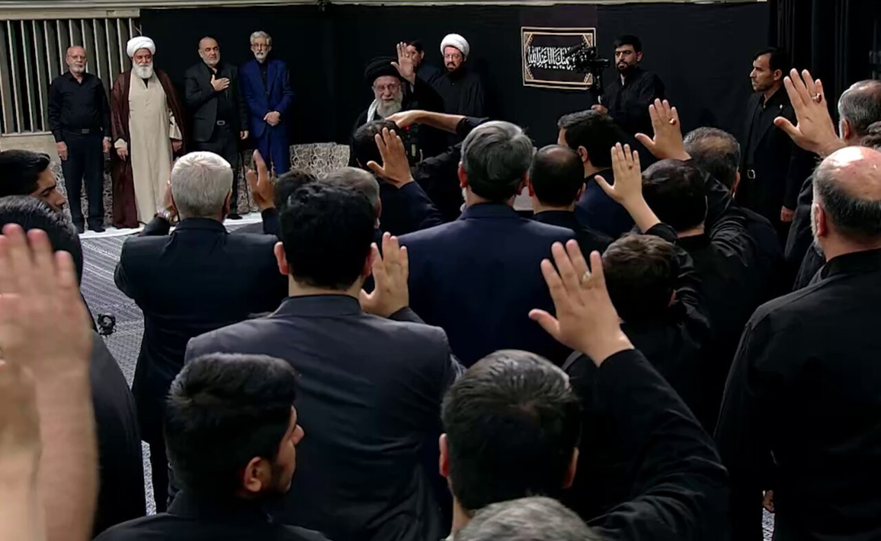با حضور رهبر معظم انقلاب اسلامی و جمعی از عزاداران حسینی در حسینیه امام خمینی، مراسم عزاداری شب تاسوعا در حال برگزاری است.