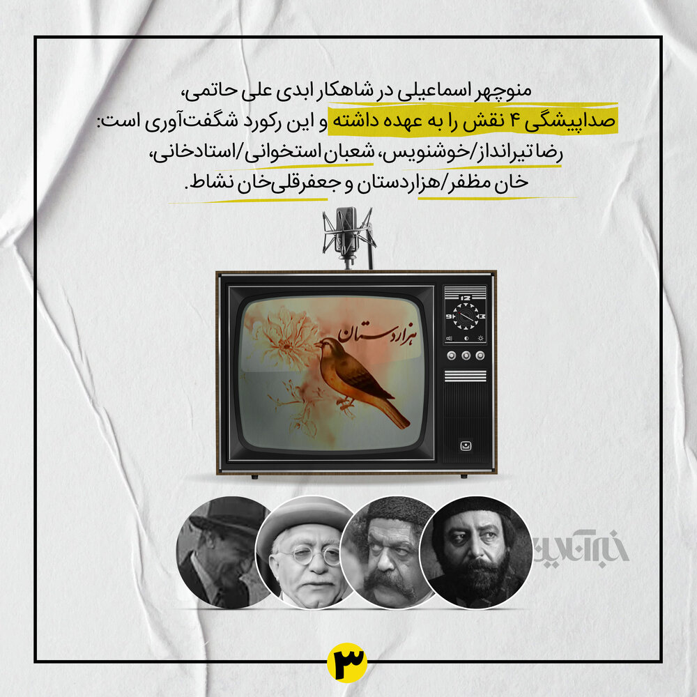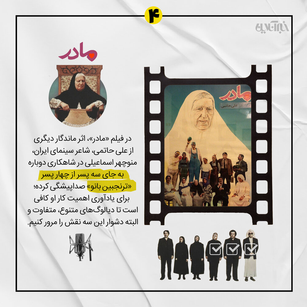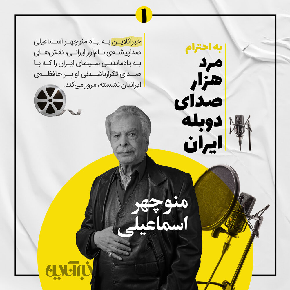 هفتهی گذشته، دوبارهی کفهی «گذشته» سنگینتر شد و سمت اکنون، سبکتر. منوچهر اسماعیلی رفت تا دوباره باور کنیم که صداست که میماند. خبرآنلاین به احترام مرد هزارصدای دوبلهی ایران، منوچهر اسماعیلی را چهرهی هفتهی گذشته معرفی میکند و چند نقش ماندنی از سینمای ایران را که او صداپیشگی کرده، با شما مرور میکند. شما هم میتوانید اینجا از صدای منوچهر اسماعیلی بنویسید، از خاطراتی که با نقشهای دوبله شده توسط او دارید یا صداپیشگیِ نقشهایی که به نظر شما به یادماندنیترند.
