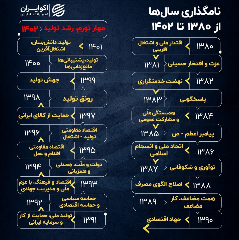 - سال 1402 از سوی رهبری با عنوان «مهار تورم، رشد تولید» نامگذاری شد.
