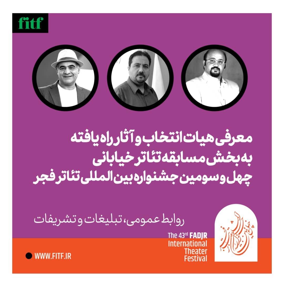 به گزارش خبرگزاری خبرآنلاین به نقل از روابط عمومی چهل و سومین جشنواره بینالمللی تئاتر فجر، هیات انتخاب بخش مسابقه تئاتر خیابانی در این دوره متشکل از محمد لارتی، سیاوش چراغیپور و سامان خلیلیان اسامی آثار راهیافته به بخش نهایی را بدین شرح معرفی کردند: