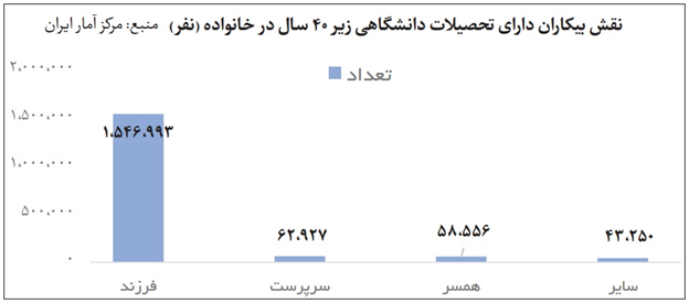 از نگاهی دیگر به این ماجرا، بیشترین تعداد این گروه از بیکاران معادل یکمیلیون و 547 هزار نفر، در خانواده نقش فرزند را دارا هستند. بهعبارتدیگر، بیش از 90 درصد بیکاران فارغالتحصیل دانشگاهی زیر 40 سال کشور، همچنان بهعنوان فرزند در کنار خانواده زندگی میکنند و عمدتاً بار مالی معیشت آنها نیز بر گرده خانوادههاست.
