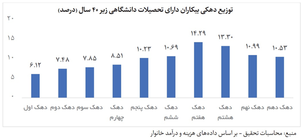 برآوردهای انجام شده بر پایه اطلاعات سامانه ملی اشتغال و مرکز آمار ایران حاکی از این است که در سال 1399 حدود 52 درصد بیکاران دارای تحصیلات دانشگاهی زیر 40 سال در ایران را مردان و 48 درصد را زن تشکیل میدادند. از نگاهی دیگر، بررسی جمیع بیکاران این گروه به تفکیک دهکهای درآمدی نیز حاکی از این است که بیشترین سهم از این جمعیت بیکاران معادل 14.3 درصد به دهک هفتم درآمدی مربوط میشود و درمجموع، دهکهای متوسط درآمدی (از 4 تا 7) با سهم 46.3 درصدی، بیشترین سهم را بیکاران فارغالتحصیل زیر 40 ساله کشور دارند.