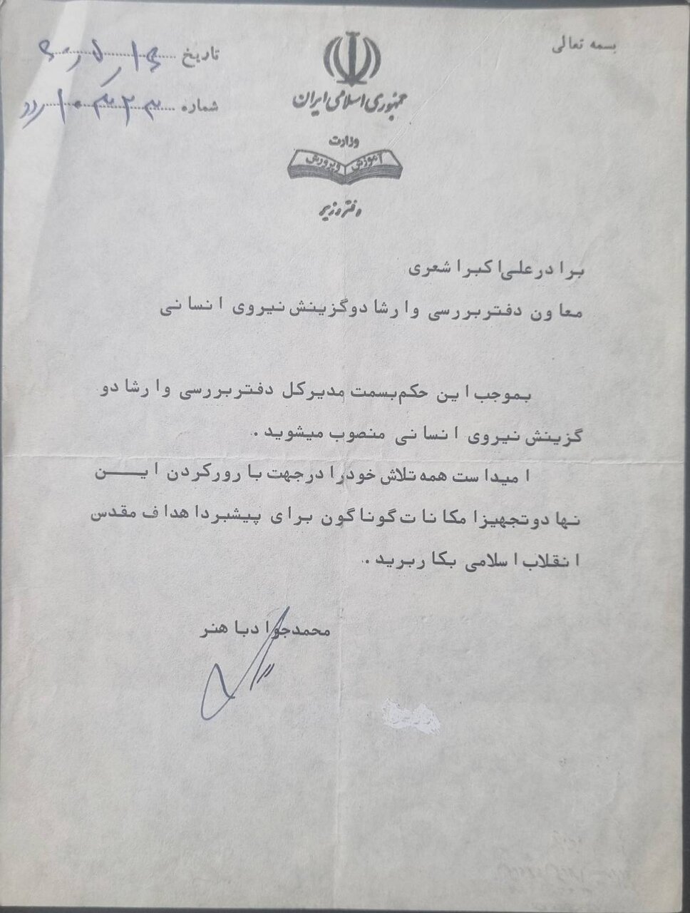 حکم شهید محمدجواد باهنر برای علی اکبر اشعری در سال 1360