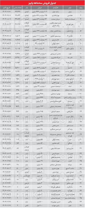 در سه ماه پاییز 47 فیلم روی روی پرده سینما رفته که در این میان ژانر درام با 25 اثر بیشترین سهم را داشته است. بعد از آن 12 فیلم کمدی، شش اثر کودک و نوجوان، دو فیلم اکشن، یک اثر دفاع مقدس و یک اثر تاریخی میزبان 10 میلیون و 687 هزار و 799 مخاطب در 241 هزار و 483 سانس بوده است. در این 90 روز گیشه سینما 586 میلیارد و 340 میلیون و 225 هزار تومان فروخته که این رقم نسبت به دو فصل اول سال 1403 روند افزایشی داشته است.
