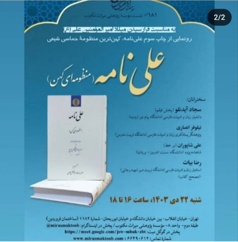گروه اندیشه: به مناسبت فرارسیدن میلادامیرالمومنین علی (ع) نشست رونمایی از چاپ سوم علی نامه، کهن ترین منظومه حماسی شیعی از سوی موسسه پژوهشی میراث مکتوب برگزار می شود.