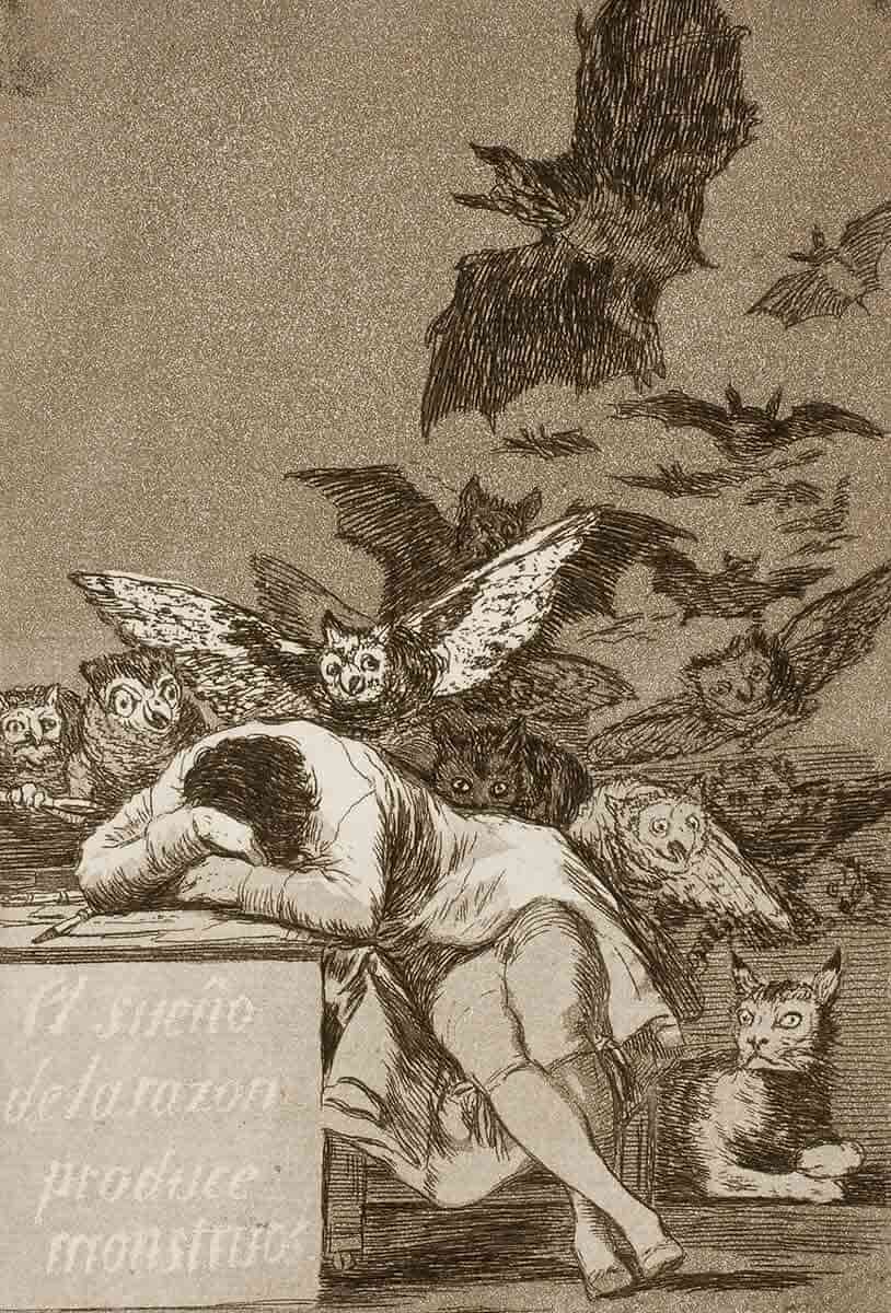 بدبینی گویا تا آنجا پیش رفت که جهان اطراف خود را از دریچه ای جدید نگریست اما او همچنان به ارزشهای روشنگرانه خود پایبند بود. دیدگاههای او با جامعه آن روزگار اسپانیا در تضاد بود زیرا او به طور مداوم متوجه نادانی دیگران میشد. او آنها را خرافاتی، نادان و بیهوده میدانست. او در سال 1797 مجموعه طراحی شامل 80 اثر چاپ می کند که نقدهایی نمادین به جامعه اسپانیا است. گویا اجنه، غولها، جادوگران و تصاویر آزاردهندهتر را به تصویر میکشد تا پیام خود را به بیننده ارسال کند.