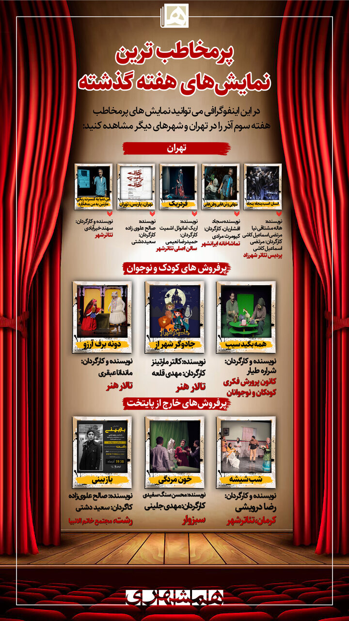 در هفته سوم آذر نمایش «تنهایی و تن هایی وطن هایی» به نویسندگی سجاد افشاریان و کارگردانی کیومرث مرادی در تماشاخانه ایرانشهر به فروش 3 میلیارد و 234 میلیون تومان رسید. نمایش «دنیا یه کنسرت ریکی مارتین به من بدهکاره» به نویسندگی سهند خیرآبادی و با بازی امیرمهدی ژوله و الیکا عبدالرزاقی هم بیش از 650 میلیون تومان بلیت فروخت. نمایش «فردریک» هم به تازگی در سالن اصلی تئاترشهر روی صحنه رفته است، توانسته نامش را در فهرست نمایش های پرمخاطب ثبت کند. این نمایش از متن های اریک امانوئل اشمیت است و حمیدرضا نعیمی آن را کارگردانی کرده است. علاوه بر آن نمایش «انسان / اسب، پنچاه / پنجاه» نوشته هاله مشتاقی نیا و مرتضی اسماعیل کاشی با کارگردانی مرتضی اسماعیل کاشی در پردیس تئاتر شهرزاد بدون حضور هیچ بازیگر شناخته شده ای، یکی از پرمخاطب ترین ها بوده است.