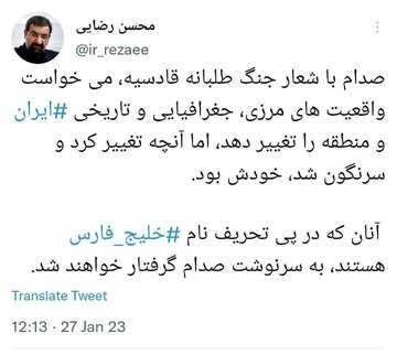 صدام با شعار جنگ طلبانه قادسیه، می خواست واقعیت های مرزی، جغرافیایی و تاریخی ایران و منطقه را تغییر دهد، اما آنچه تغییر کرد و سرنگون شد، خودش بود. آنان که در پی تحریف نام خلیج فارس هستند، به سرنوشت صدام گرفتار خواهند شد.
