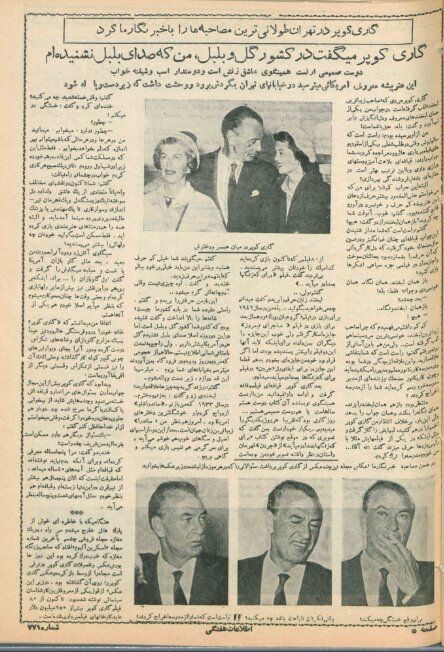 به گزارش خبرگزاری خبرآنلاین، گاری کوپر (1901-1961/1280-1340) هنرپیشهی معروف آمریکایی صاحب دو جایزهی اسکار، در دههی 30 چنان در ایران محبوبیت داشت که وقتی در اواخر خرداد 1335 به ایران آمد، به محض اینکه پایش را در فرودگاه گذاشت مردم برای ابراز ارادت به سمتش هجوم بردند آنچنان که تا چند روز بعد میترسید قدم از هتل محل اقامتش بیرون بگذارد! در همان زمان خبرنگار اطلاعات هفتگی به دیدارش رفت و حاصل این دیدار شد گفتوگویی کوتاه و خواندنی که در اطلاعات هفتگی به تاریخ 25 خرداد 1335 منتشر گردید. در ادامه بخشهایی از این گفتوگو را میخوانید: