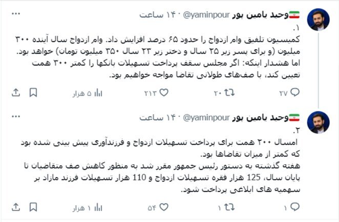 وحید یامینپور معاون امور جوانان وزیر ورزش و جوانان در صفحه مجازی خود در شبکه اجتماعی ایکس (توییتر) نوشت: «کمیسیون تلفیق وام ازدواج را حدود 65 درصد افزایش داد. وام ازدواج سال آینده 300 میلیون (و برای پسر زیر 25 سال و دختر زیر 23 سال 350 میلیون تومان) خواهد بود.