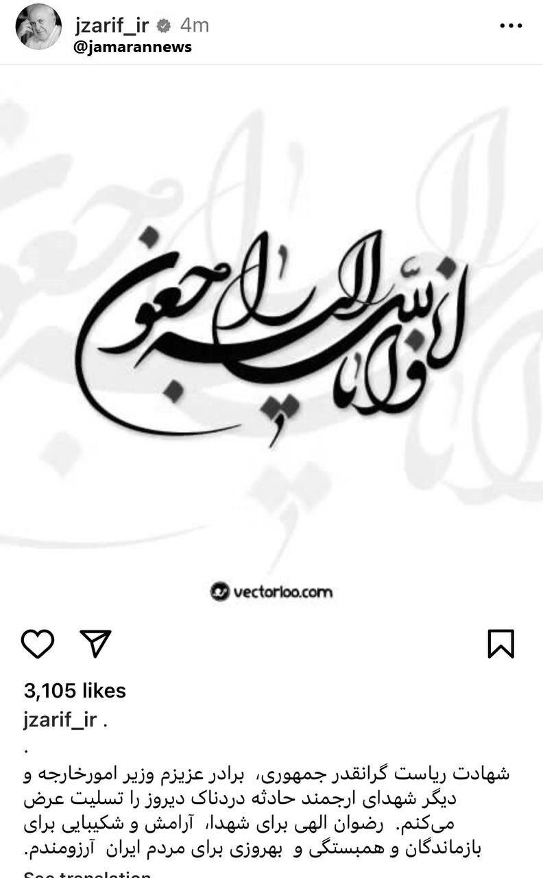 شهادت ریاست گرانقدر جمهوری، برادر عزیزم وزیر امور خارجه و دیگر شهدای ارجمند حادثه دردناک دیروز را تسلیت عرض می کنم. رضوان الهی برای شهدا، آرامش و شکیبایی برای بازماندگان و همبستگی و بهروزی برای مردم ایران آرزومندم.