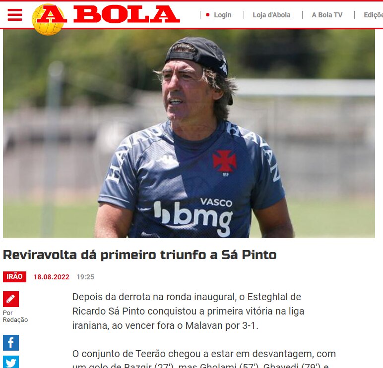 برد تیمهای استقلال و سپاهان با کادرفنی پرتغالی خود در هفته دوم لیگ برتر در مطبوعات کشور پرتغال هم بازتاب داشت.