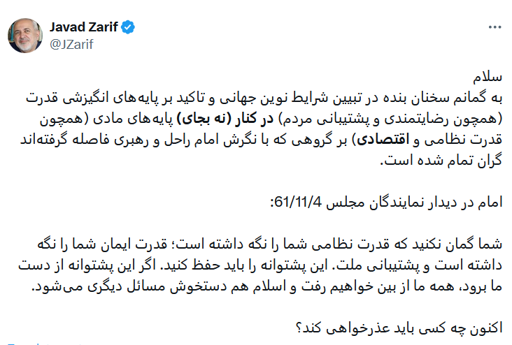 محمدجواد ظریف، وزیر امور خارجه سابق کشورمان در واکنش به انتقاد حسین شریعتمداری در توییتی نوشت: «سلام به گمانم سخنان بنده در تبیین شرایط نوین جهانی و تاکید بر پایههای انگیزشی قدرت (همچون رضایتمندی و پشتیبانی مردم) در کنار (نه بجای) پایههای مادی (همچون قدرت نظامی و اقتصادی) بر گروهی که با نگرش امام راحل و رهبری فاصله گرفتهاند گران تمام شده است.