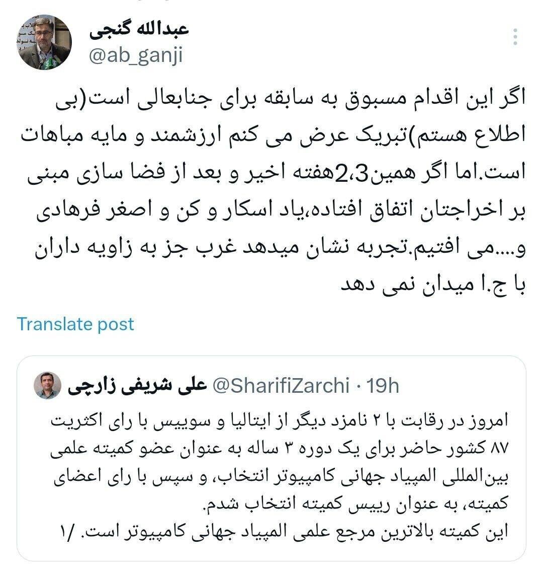 عبدالله گنجی در توئیتی به توئیتی استاد اخراج شده دانشگاه شریف درباره یک موفقیت جهانی اش واکنش نشان داد.