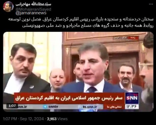 سید عطاءالله مهاجرانی، وزیر فرهنگ و ارشاد سابق، با انتشار یادداشتی در شبکه اجتماعی ایکس، به اظهارات نیچروان بارزانی واکنش نشان داده و نوشته است: