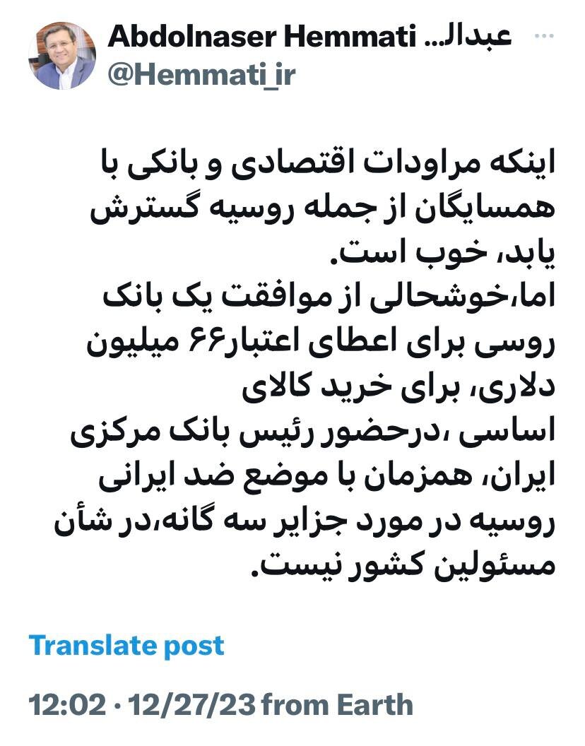 به گزارش خبرگزاری خبرآنلاین، عبدالناصر همتی در تازهترین یادداشت در فضای مجازی نوشت: اینکه مراودات اقتصادی و بانکی با همسایگان از جمله روسیه گسترش یابد، خوب است.