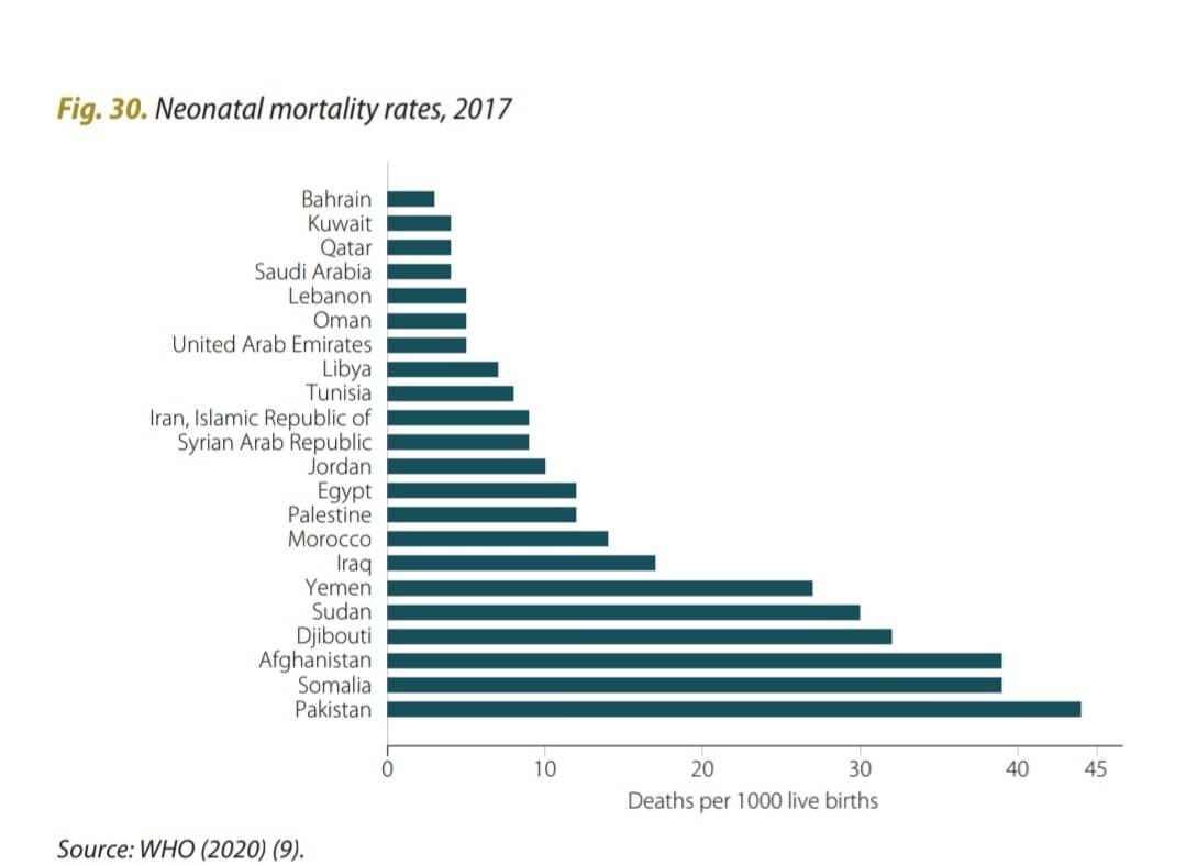 نمودار زیر از آخرین گزارش سازمان جهانی بهداشت در منطقه مدیترانه شرقی (2020) درباره شاخص مرگومیر نوزادان زیر یک ماه است، در این گزارش بحرین، کویت، قطر، عربستان سعودی، لبنان، عمان، امارات متحده عربی، لیبی و تونس جایگاه بالاتری از ایران دارند. در این شاخص پاکستان، سومالی و افغانستان سه کشور انتهای نمودار هستند.