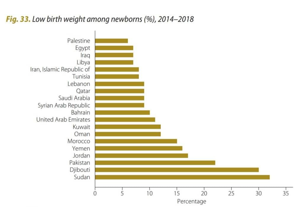 منبع: سازمان بهداشت جهانیکمبود وزن هنگام تولد از جمله شاخصهای سلامت است، نمودار زیر نشان میدهد در این شاخص هم کشورهای فلسطین، مصر، عراق، لیبی از ایران جلوتر هستند.