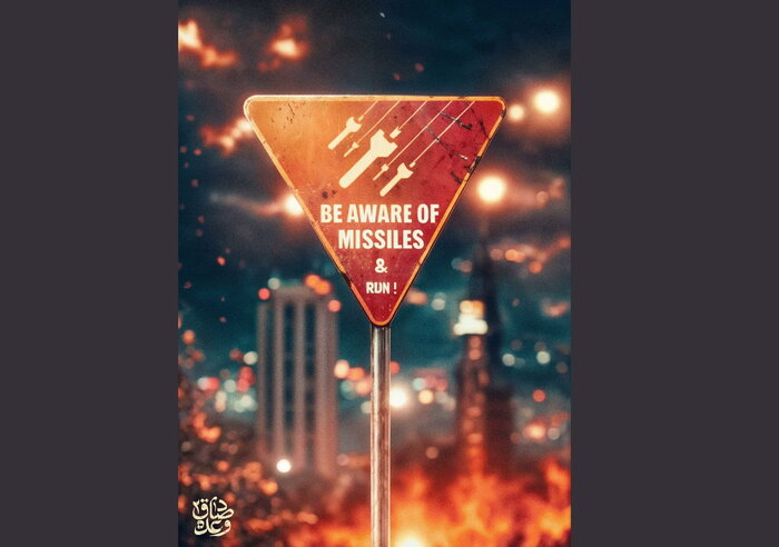 «وعده صادق 2» با مضمون «BE AWARE OF MISSILES & RUN مراقب موشکها باشید و فرار کنید.» با طراحی گرافیک صالح کوشکی