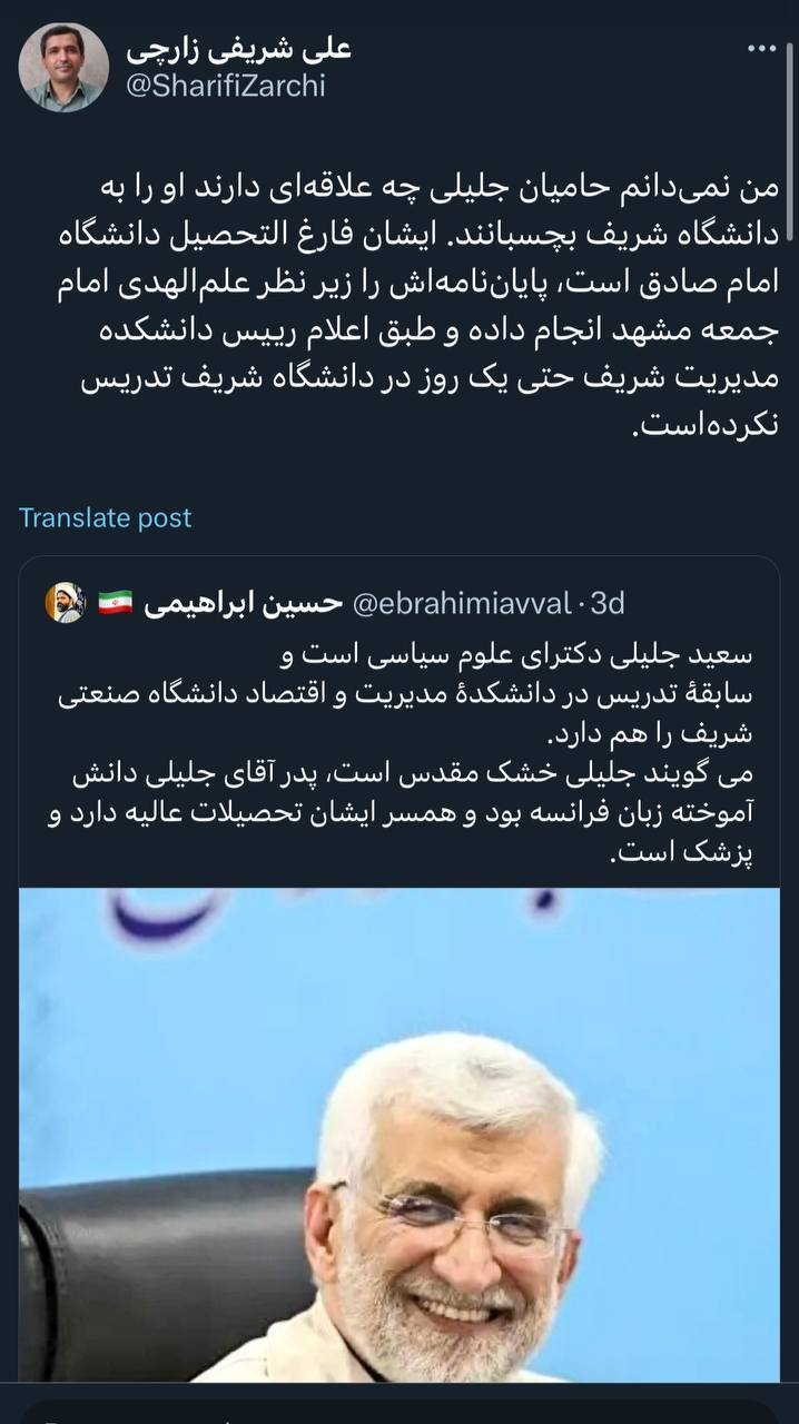 من نمیدانم حامیان جلیلی چه علاقهای دارند او را به دانشگاه شریف بچسبانند. ایشان فارغ التحصیل دانشگاه امام صادق است، پایاننامهاش را زیر نظر علمالهدی امام جمعه مشهد انجام داده و طبق اعلام رییس دانشکده مدیریت شریف حتی یک روز در دانشگاه شریف تدریس نکردهاست.