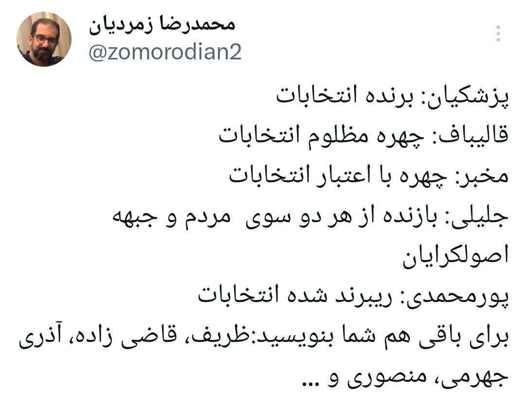 به گزارش خبرگزاری خبرآنلاین، محمدرضا زمردیان یک فعال رسانه ای، درباره نتایج چهرهای انتخابات ریاست جمهوری چهاردهم در شبکه اجتماعی ایکس نوشت: