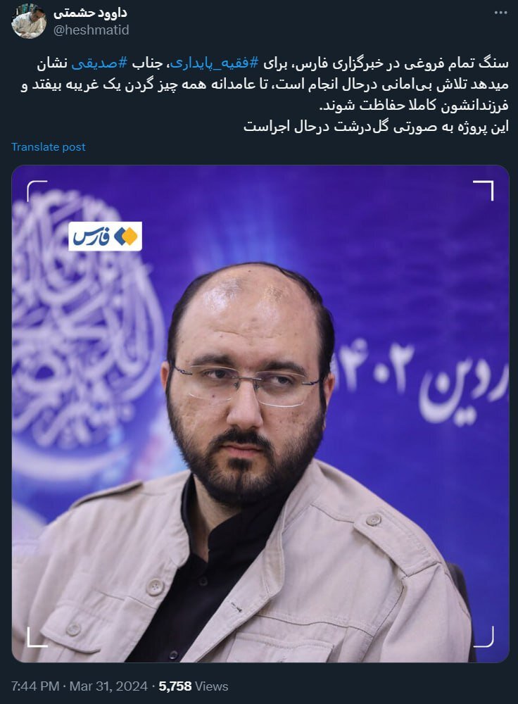 پس لرزه دفاع فروغی از کاظم صدیقی / تلاشی در حال انجام است، تا عامدانه همه چیز گردن یک غریبه بیفتد و فرزندان صدیقی حفاظت شود