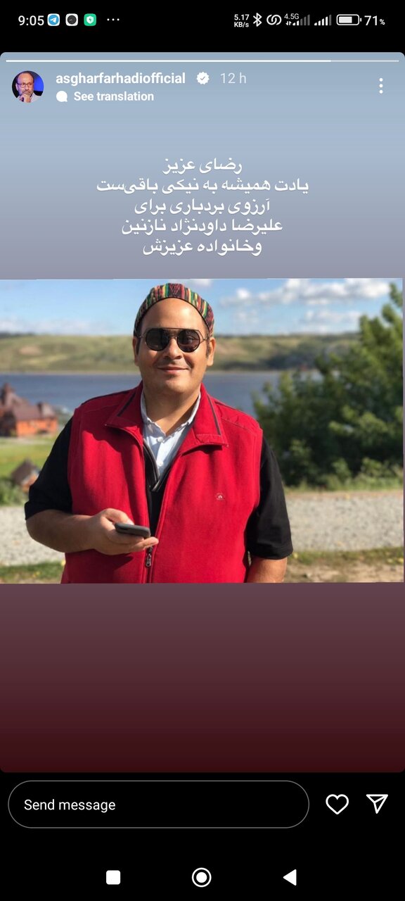 اصغر فرهادی، با انتشار یک استوری درگذشت رضا داوودنژاد را تسلیت گفت.