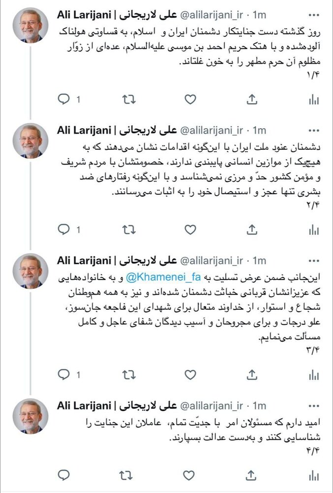 اینجانب ضمن عرض تسلیت به رهبر معظم انقلاب و به خانوادههایی که عزیزانشان قربانی خباثت دشمنان شدهاند و نیز به همه هموطنان شجاع و استوار، از خداوند متعال برای شهدای این فاجعه جانسوز، علو درجات و برای مجروحان و آسیب دیدگان شفای عاجل و کامل مسألت مینمایم.
