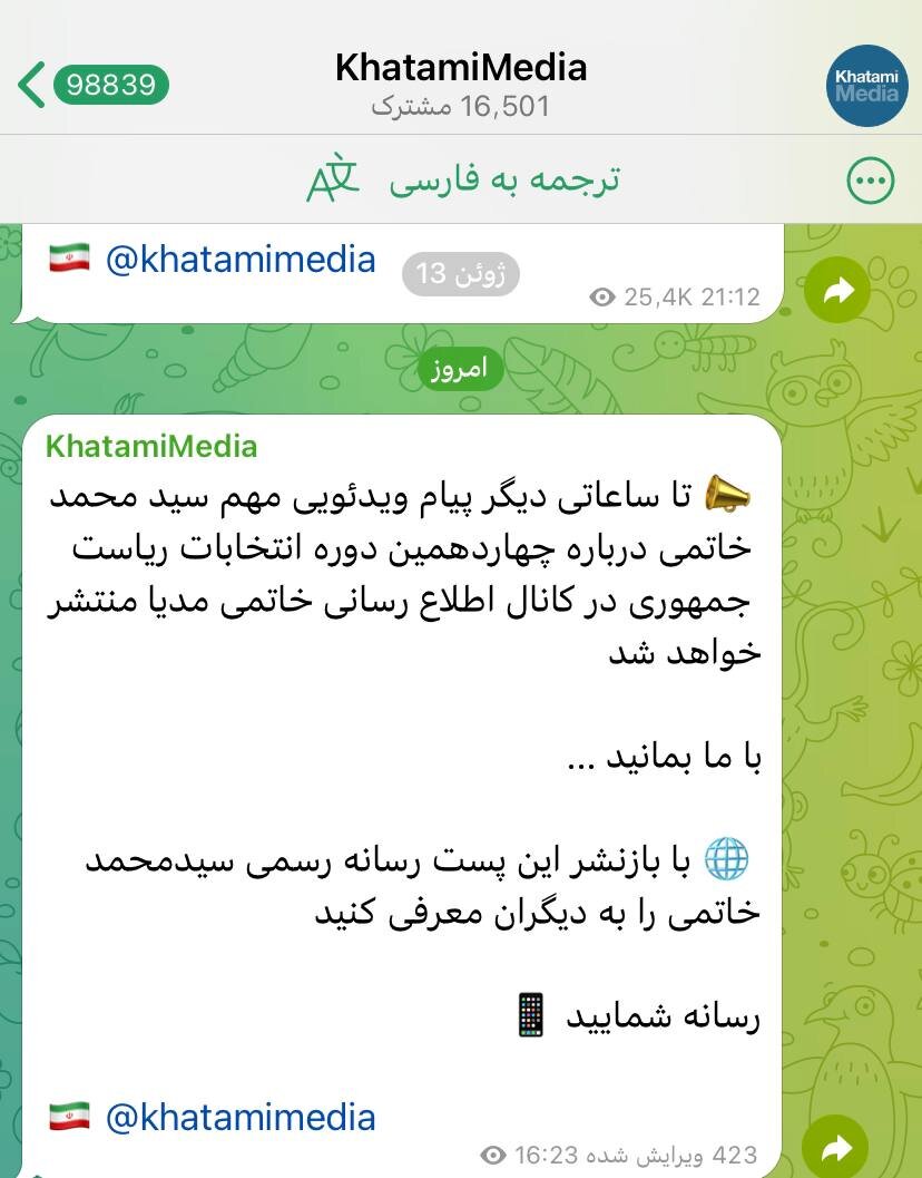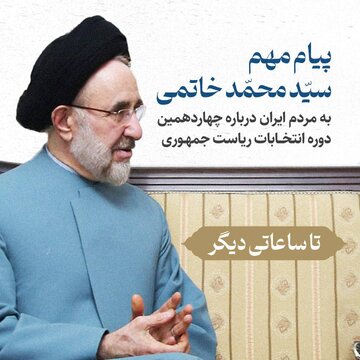 به گزارش خبرگزاری خبرآنلاین، کانال تلگرامی حجت الاسلام سیدمحمد خاتمی نوشت: تا ساعاتی دیگر پیام ویدئویی مهم سید محمد خاتمی درباره چهاردهمین دوره انتخابات ریاست جمهوری در کانال اطلاع رسانی خاتمی مدیا منتشر خواهد شد