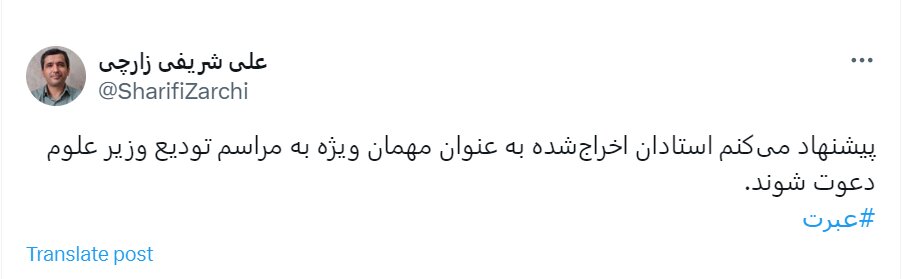 به گزارش خبرآنلاین، علی شریفی زارچی در شبکه اجتماعی ایکس / توییتر با هشتگ عبرت نوشت: پیشنهاد میکنم استادان اخراجشده به عنوان مهمان ویژه به مراسم تودیع وزیر علوم دعوت شوند.