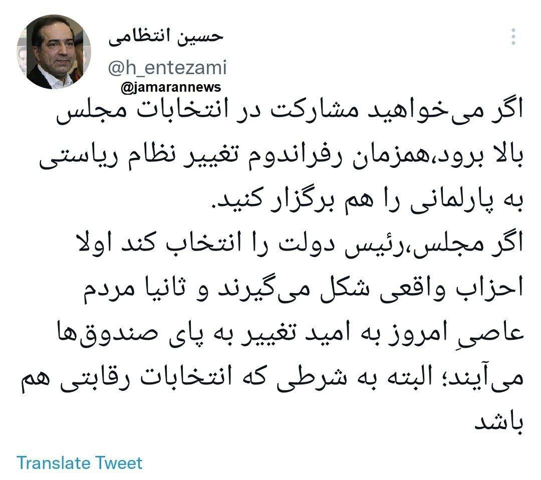 حسین انتظامی معاون اسبق وزارت ارشاد در توییتی نوشت: اگر میخواهید مشارکت در انتخابات مجلس بالا برود، همزمان رفراندوم تغییر نظام ریاستی به پارلمانی را هم برگزار کنید.