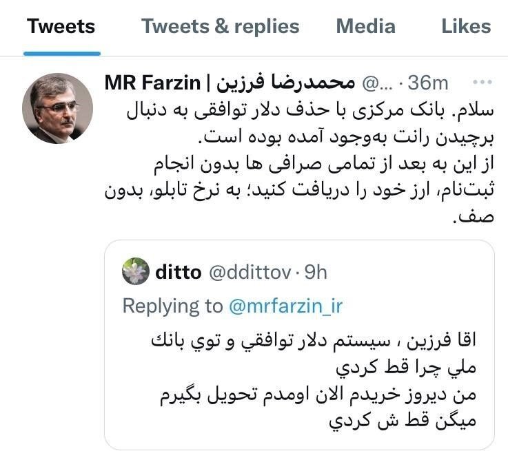 به گزارش خبرگزاری خبرآنلاین، محمدرضا فرزین در پاسخ به پرسش یکی از کاربران فضای مجازی درباره چرایی حذف دلار توافقی و مشکلات پیش آمده برای خریداران دلار توافقی طی روز گذشته، اعلام کرد: بانک مرکزی با حذف دلار توافقی به دنبال برچیدن رانت به وجود آمده بوده است.