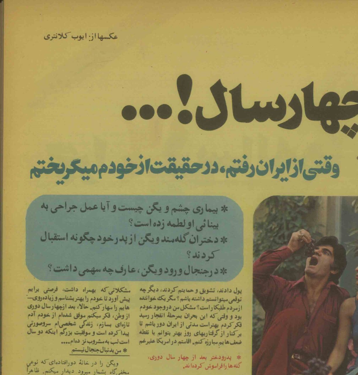 مجبورم برگردم چون همسرم و دو فرزندم «ادوین» و «ملودی» در آمریکا هستند و در خانهای که در هالیوود خریدهام به سر میبرند. به علاوه باید چشم دیگرم را عمل کنم و قراردادی هم برای بازی در یک فیلم مشترک ایران و آمریکا دارم که «سوزان پلشت» در آن نقش مقابل مرا بازی میکند... من واقعا علاقهای به ماندن در آمریکا ندارم و زندگی ماشینی آنجا با روحیهام سازگار نیست. چهار سال اقامت در آمریکا خیلی چیزها را برایم روشن کرد. ما در ایران خیلی نعمتها داریم که قدرش را نمیدانیم. یکی از این نعمتها، احساس و عاطفه و انسانیت است که ناشی از فرهنگ کهن و تمدن ریشهدار ماست و زندگی ماشینی هرگز نمیتواند جای آن را بگیرد. در آمریکا سرنوشت همه چیز تقریبا با کامپیوتر تعیین میشود و این برای ما غیر قابل تحمل است.