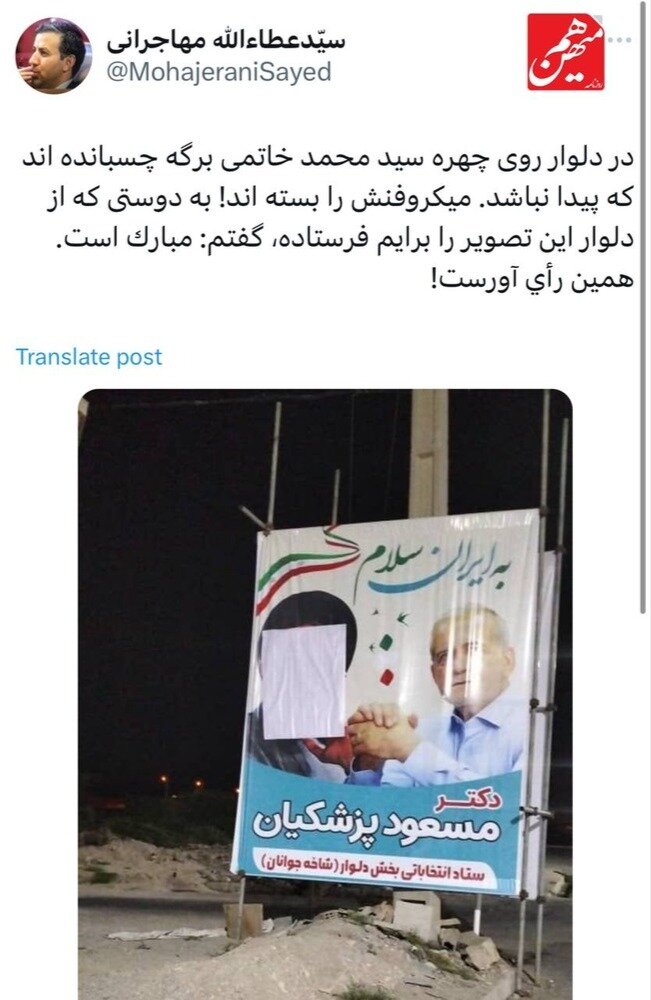 به گزارش خبرگزاری خبرآنلاین، عطاالله مهاجرانی با انتشار تصویری از پوشاندن چهره سیدمحمد خاتمی در بنر تبلیغاتی مسعود پزشکیان در مطلبی در شبکه اجتماعی ایکس نوشت: