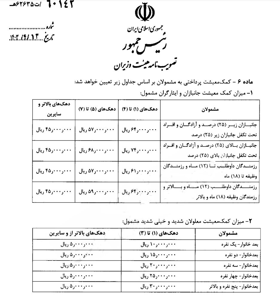 جدول ارقام پرداخت ماهانه کمک معیشتی به جانبازان و معلولان مُعسر فاقد شغل به شرح زیر است: