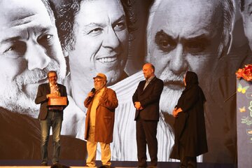 سپس اکبر عبدی، مرضیه برومند و مجید زینالعابدین دبیر جشنواره برای برگزاری آیین نکوداشت بهرام دهقانیار روی صحنه آمدند.