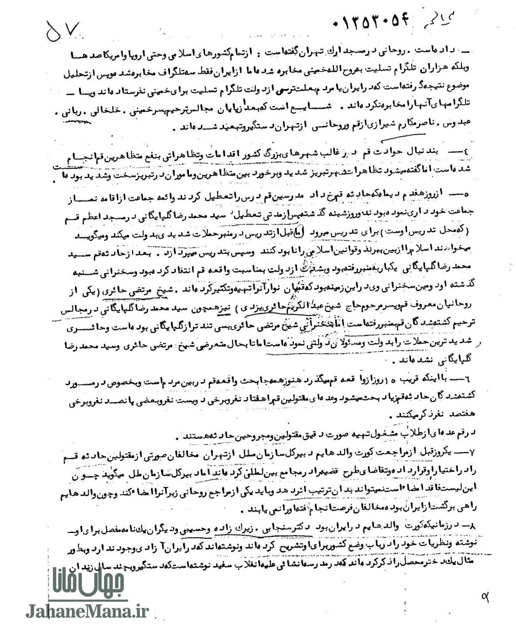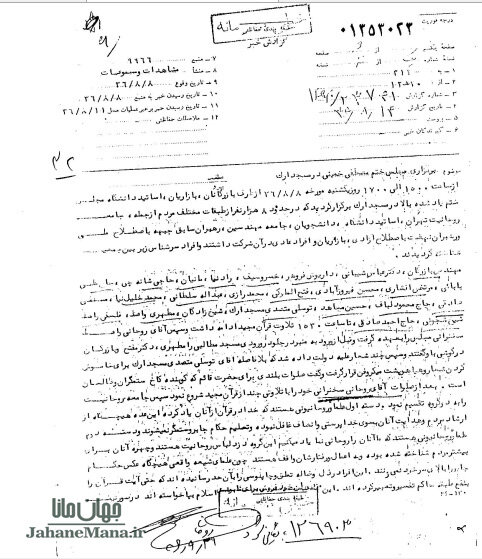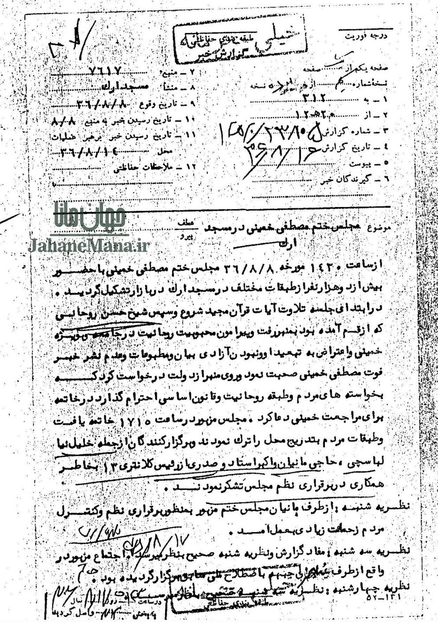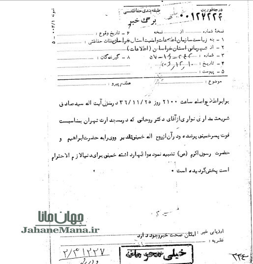 از جمله این گزارش ها، می توان به گزارشی اشاره کرد که در تاریخ 25 بهمن 1356 توسط شهربانی استان خراسان برای ریاست ساواک استان تهیه شده بود و تصویر آن را می بینید: