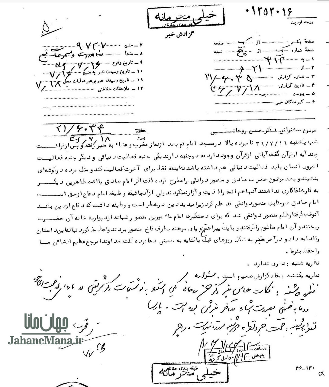آنگونه که جهان مانا روایت کرده، این گزارش در تاریخ شانزدهم مهر 1356در خصوص سخنرانی حسن روحانی در مسجد امام حسن عسگری قم است. حسن روحانی طبق گزارش ساواک، در این سخنرانی راجع به علت مبارزه امام جعفر صادق (ع) با حکومت منصور دوانیقی صحبت می کند و "برای آیت الله خمینی دعا میکند".
