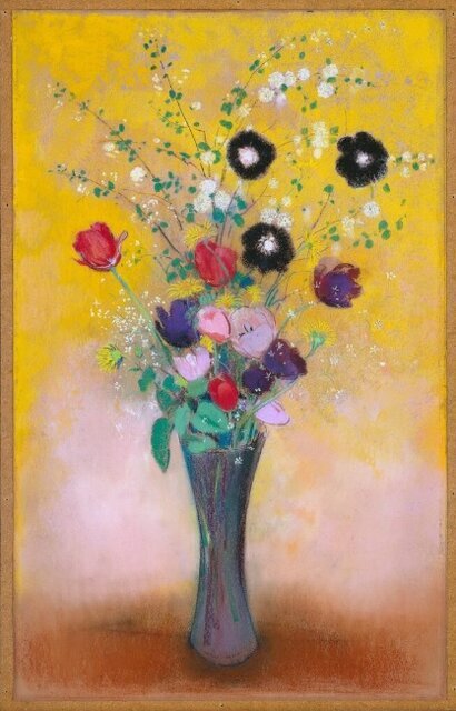 «اودیلون ردون»(Odilon Redon)(1840-1916) نقاش نمادگرایی بود که به خاطر تصاویر تاریک و نگرانکنندهاش و موجودات عجیب و غریب از دنیایهای فانتزی و تقریباً کابوسوار شناخته میشود. در سالهای اولیه حرفهاش، قبل از دهه 1890، عمدتاً با زغالچوب و لیتوگرافی کار میکرد. این دوره با تصاویری مرموز و سایهگونه مشخص میشد. با این حال، پس از دهه 1890، ردون به استفاده از پاستل و رنگ روغن روی آورد که تأثیرات ژاپنیگرایی او را نشان میدهد. این تغییر باعث شد تا سبک او به سوی سبک بیانیتر و زندهتری حرکت کند و او اکنون بهعنوان پیشگام سورئالیسم شناخته میشود. مضمونهای گلدار در سالهای بعدی او ظاهر شدند، که احتمالاً تحت تأثیر دیدار او با یک گیاهشناس به نام «Armand Clavaud» در بوردو بوده است. این نقاشی، مانند سایر آثار این دوره، نشاندهنده علاقه جدید او به زیبایی ظریف گلهاست که تضادی شدید با مضامین تاریک آثار اولیهاش دارد.