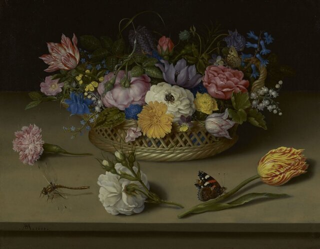 «آمبروزیوس بوسخارت پدر»(Ambrosius Bosschaert the Elder) (1573-1621) نقاش و دلال هنری پیشگام هلندی در زمینه طبیعت بیجان بود. او یکی از نخستین هنرمندانی بود که نقاشی طبیعت بیجان با گلها را به یک ژانر مستقل ارتقا داد. ترکیببندیهای او به دلیل تقارنشان شهرت دارند و هر گل با دقتی علمی ترسیم شده است. «بوسخارت» معمولاً روی قالبهای کوچک، اغلب روی مس، کار میکرد و نقاشیهایش گاهی معانی مذهبی یا نمادین داشتند. گلهای رایجی که در آثار او دیده میشوند شامل رزها و لالهها هستند، مانند نمونهای که در اینجا بررسی میکنیم. به جزئیات دقیق گلبرگها توجه کنید که بافت لطیف آنها را به تصویر میکشد. حتی حشره و پروانه در نقاشی با واقعگرایی فوقالعادهای کشیده شدهاند که مهارت و توجه «بوسخارت» به جزئیات طبیعت را نشان میدهد.