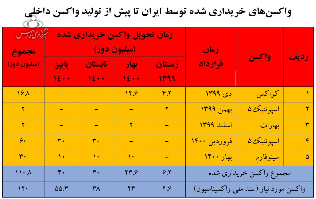 به این ترتیب، ایران تا قبل از ارائه مجوز تولید واکسن داخلی (24 خرداد 1400)، قرارداد خرید حداقل 110 میلیون دوز واکسن را بسته بود که قرار بود به تدریج تا پایان پاییز (پایان سال 2021 میلادی) وارد کشور شود. این در حالی بود که طبق سند ملی واکسیناسیون، ایران تا پایان پاییز 65 میلیون دوز و تا پایان سال 120 میلیون دوز واکسن احتیاج داشت.»
