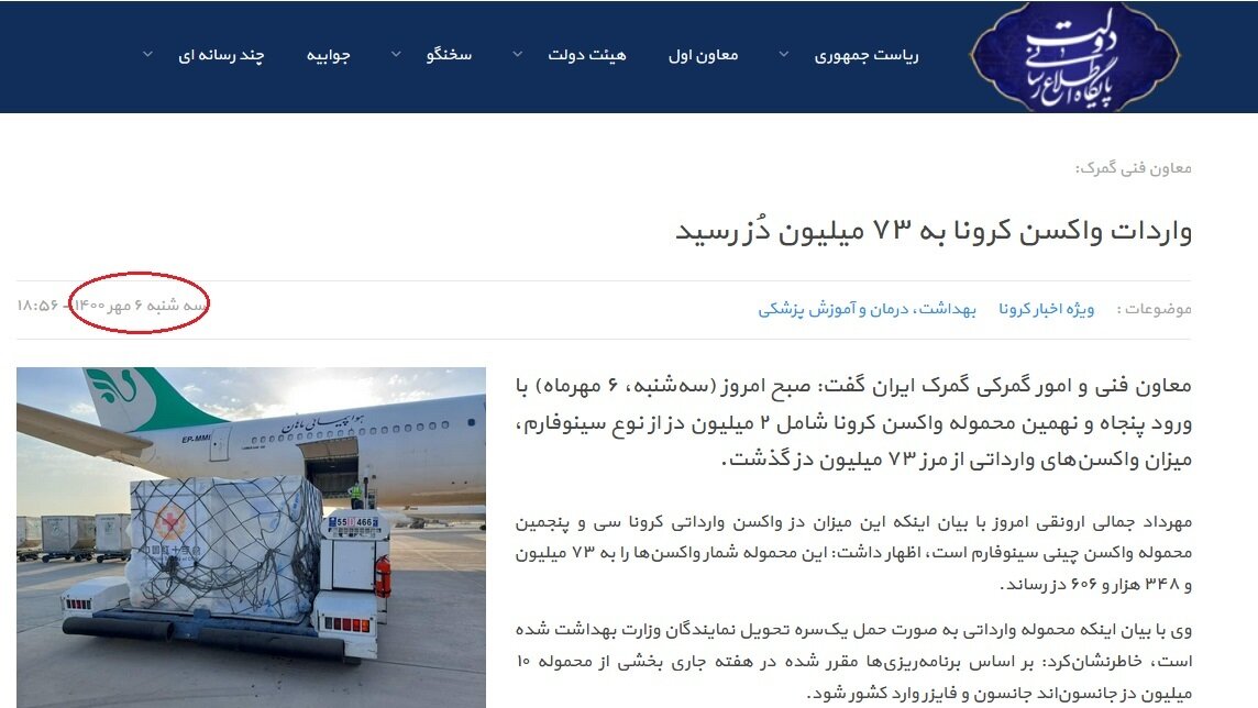 طبق گزارش خبرگزاری فارس از 110 میلیون دوزی که قرارداد آنها توسط دولت روحانی بسته شده بود، از بهمن 1399 تا 20 شهریور 49 میلیون و 877 هزار دوز واکسن کرونا وارد کشور شد. 32 میلیون و 197 هزار دوز از این میزان در 20 روز نخست شهریور 1400 وارد ایران شد و به همین دلیل شایعه ساختند که دولت جدید این واکسنها را خریده است و این در حالی است که وزیر بهداشت جدید دولت رئیسی، روز 10 شهریور معارفه شده بود و بدیهی است انعقاد قرارداد و سفارش تولید و واریز پول و ارسال محموله، در آن 10 روز نخست صورت نگرفته بود و مربوط به ماههای قبل بود.
