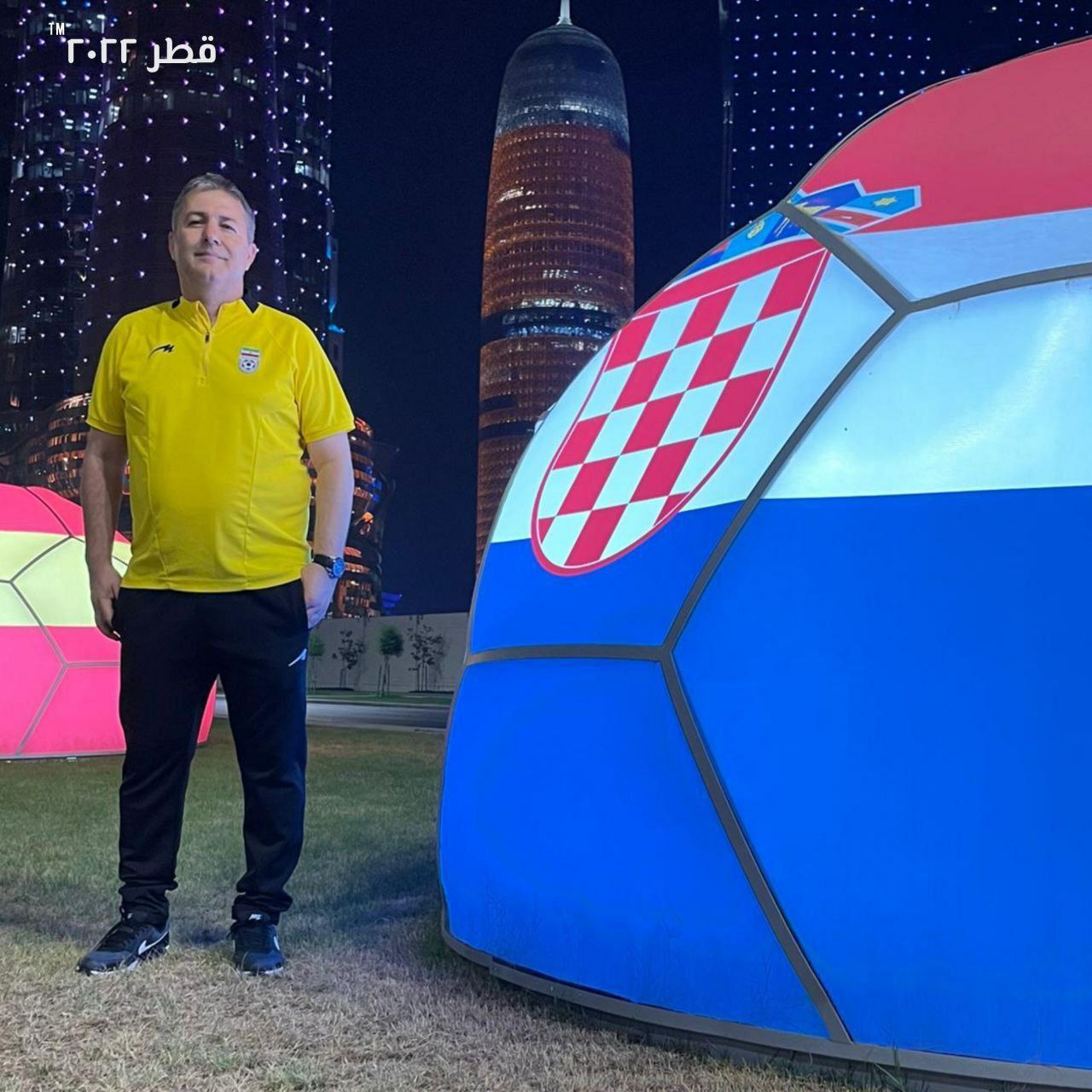 به گزارش خبرگزاری خبرآنلاین؛ دراگان اسکوچیچ سرمربی تیم ملی فوتبال ایران در کنار پرچمهای ایران و کرواسی که به دلیل صعود به جام جهانی 2022 قطر به شکل توپ فوتبال در مرکز شهر دوحه نصب شده عکس یادگاری گرفت.