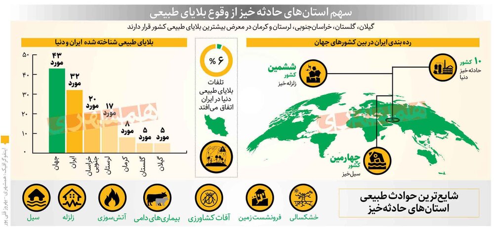 همشهری نوشت: رتبهبندی استانهای حادثه خیز از سوی سازمان مدیریت بحران کشور، نشان میدهد که استانهای گیلان، گلستان، خراسان جنوبی، لرستان و کرمان بهعنوان 5استان در معرض مخاطرات و بلایای طبیعی صدر جدول هستند. بلایای طبیعی گاه بدون منشا انسانی اتفاق میافتد؛ مثل سیل، زلزله، توفان و خشکسالی و گاهی ناشی از عملکرد انسان است؛ مثل آلودگی هوا یا سیل ناشی از تخریب جنگل واغلب با خسارتهای شدید...